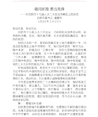 公文宝典(www.gongwenbaodian.com)收集整理,每天更新海量优质范文,让写材料变得简单!敢闯新路勇当先锋——在合肥市十七届人大二次会议闭幕会上的讲话合肥市委书记虞爱华(2023年1月2日)各位代表、各位同志:合肥市十七届人大二次会议,已经顺利完成各项议程,即将胜利闭幕。在此,我代表市委,对大会取得圆满成功,表示热烈祝贺!刚刚过去的一年,是党和国家历史上极为重要的一年,也是合肥发展史上极不寻常的一年。我们始终坚持“稳字当头、稳中求进”,积极应对“三情大考”:百年大变局的复杂世情、全球大流行的世纪疫情、五十年不遇的高温旱情,认真抓好“三件大事”:疫情要防住、经济要稳住、发展要安全...
