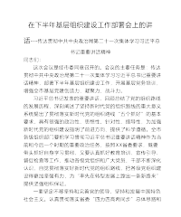 在下半年基层组织建设工作部署会上的讲话---传达贯彻中共中央政治局第二十一次集体学习习近平总书记重要讲话精神同志们:这次会议是经市委同意召开的。会议的主要任务是:传达贯彻中共中央政治局第二十一次集体学习习近平总书记重要讲话精神,部署下半年基层组织建设工作,开展基层党务培训,增强全市基层党建创造力、凝聚力、战斗力。习近平总书记发表的重要讲话,回顾总结了党的组织路线的发展历程,深刻阐述了坚持新时代党的组织路线的重大意义系统提出了贯彻落实新时代党的组织路线“五个抓好”的基本要求,具有很强的政治性、思想性、针对性、指导性,为加强新时代党的组织建设指明了前进方向、提供了科学遵循。全市各级组织部门要把学习...