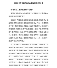 2023年学习党的二十大报告研讨材料3篇学习党的二十大报告研讨材料1通过本次培训学习收获很多,下面结合个人思想和工作实际做以简要汇报:党的20大描绘了全面建设社会主义现代化国家、全面推进中华民族伟大复兴的宏伟蓝图。作为一名基层党员干部,始终坚持以党的二十大精神为指引,在新时代新征程党的使命任务中找准方位,按照“五个牢牢把握”重大要求,在工作中努力解放思想,不断学习新知识、新理念,传承红色基因,在全面学习、全面把握、全面落实上下功夫,撸起袖子加油干,一步一个脚印,努力开创工作新局面。一、坚守初心,勇担使命。初心如磐,方能致远。一是努力学习理论知识,坚持不懈用习近平新时代中国特色社会主义思想凝心铸...