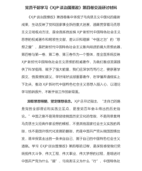 第四卷交流研讨材料:凝心聚力走好实现第二个百年奋斗目标新的赶考之路《习近平谈治国理政》第四卷生动记录了以习近平同志为核心的党中央团结带领全党全国各族人民应变局开新局的伟大实践,汇集了一系列原创性的治国理政新理念新思想新战略,通篇贯穿着马克思主义的立场、观点、方法,集中展现了马克思主义中国化的与时俱进和坚实步伐,是我们认识和理解“中国之治”的思想之窗,也是把新时代中国特色社会主义推向前进的强大的思想武器。一、整体把握《习近平谈治国理政》全四卷的思想联系与理论价值充分认识《习近平谈治国理政》第一至第四卷是有思想联系的,它们的理论价值是一脉相承的,集中反映的是中国特色社会主义进入新时代以来,习近平新...