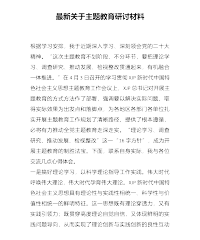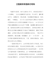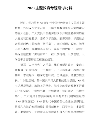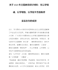 关于2023年主题教育研讨材料:在以学铸魂、以学增智、以学促干方面取得实实在在的成效近日,学习贯彻习近平新时代中国特色社会主义思想主题教育工作会议在北京召开。开展主题教育是今年党的建设的重大任务,广大党员干部要深刻认识开展主题教育的重大意义和目标要求,坚持以学当先、勤思深悟、学用结合,谱写新时代主题教育“新乐章”,旗帜鲜明讲政治、驰而不息长本领、挺膺担当向前行,奏响主题教育“三部曲”,确保主题教育“掷地有声”,在以学铸魂、以学增智、以学促干方面取得实实在在的成效。谱写“以学当先”之乐章,旗帜鲜明讲政治,奏响主题教育“以学铸魂”“主题曲”。“忠诚是魂,魂固方能神聚;忠诚是根,根深方能叶茂;忠诚是...