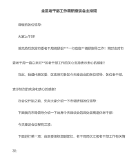 全区老干部工作调研座谈会主持词尊敬的各位领导:大家上午好!首先热烈欢迎市委老干局调研组***一行莅临**调研指导工作!同时也对市委老干局一直以来对**区老干部工作的关心支持表示衷心的感谢!在此,我谨代表区委、区政府对参加今天座谈会的各位领导、各位老干部,表示热烈的欢迎和衷心的感谢!在会议开始之前,先向大家介绍一下市调研组各位领导:下面我向市局领导介绍一下出席今天座谈会的县处级离退休老干部:今天座谈会议程有三项:下面进行第一项:由区委组织部副部长、老干局局长汇报老干部工作有关情况;..........下面进行第二项:座谈交流。..........既然是座谈会,就是聊天、谈心,请各位老领导不要拘束...