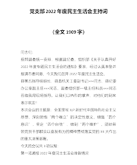 党支部2022年度民主生活会主持词(全文1909字)同志们:按照县委统一安排,根据县纪委、组织部《关于认真开好2022年度专题民主生活会的通知》要求,经过认真准备并报请市委同意,今天我们召开2022年度民主生活会。县第五指导组组长、县直机关工委副书记×××同志、县纪委办公室副主任×××同志、县委组织部一级主任科员×××同志莅临我局现场指导。让我们以热烈的掌声,对他们的到来表示欢迎!本次会议的主题是:全面贯彻习近平新时代中国特色社会主义思想,深刻领悟“两个确立”的决定性意义,增强“四个意识”,坚定“四个自信”、做到“两个维护”,团结带领党员干部群众以奋发有为的精神贯彻落实党的XX大作出的重大决策...