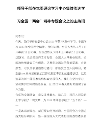 领导干部在党委理论学习中心集体传达学习全国“两会”精神专题会议上的主持词同志们:今天,我们举行党委中心组2023年第*次集体学习,专题学习2023年全国两会精神。我们知道,全国人大从3月5日开幕到13日闭幕,全国政协从3月4日开幕到11日闭幕,这期间,无论是政府工作报告、全国人大常委会报告、全国政协常委会工作报告,还是审议通过的各类草案、方案报告,以及代表通道答记者问,都备受全国人民瞩目。特别是xxx总书记在参加江苏代表团审议时的重要讲话,以及选举的新一届国家机构和政协领导人,我们在坚持学习、坚决拥护的同时倍感振奋,在2023年春天更好地凝聚了奋斗力量。今年的全国两会,意义非常重大。前几天,我...