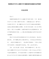 党委理论学习中心组集中学习国防教育及国家安全专题研讨会主持词 同志们: 根据局党委理论学习中心组集中学习研讨安排,今天,我们组织召开2024年第X次集中学习研讨,主要是通过自学、集中学习、交流研讨的方式,深入理解习近平总书记关于加强全民国防教育、国家安全教育的重要论述精神。本次研讨的主题是,深入学习贯彻党的二十届三中全会精神,全面贯彻新时代全民国防教育方针,坚定不移将改革进行到底,以X事业高质量发展奋力谱写中国式现代化新篇章。 参加今天会议的有局党委理论学习中心组全体成员,各处室主要负责人,各下属事业单位主要负责同志。今天的会议共有四项议程,一是组织开展集中学习;二是由我作专题辅导;三是...